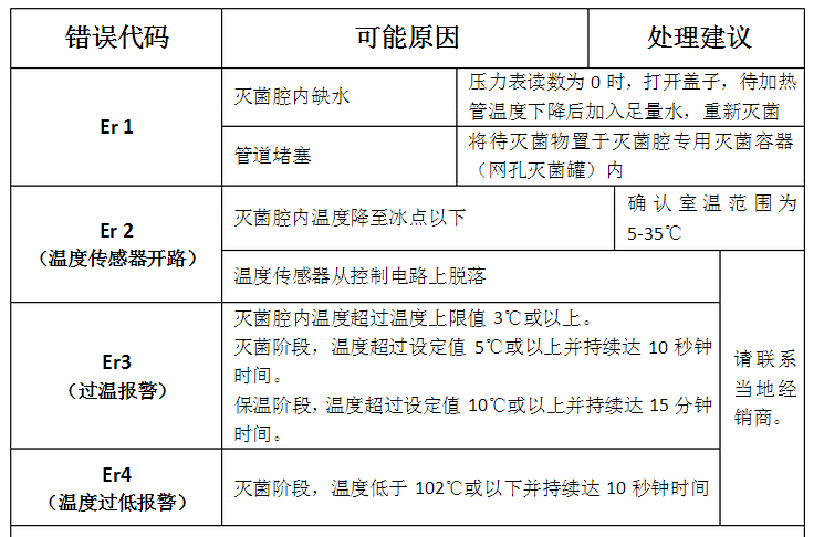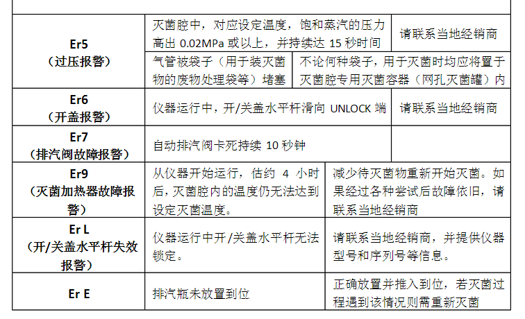 功能異常時,錯誤檢測電路將觸發以確保安全。電路激活時,錯誤代碼在顯示屏顯示并聲音報警。按START/STOP鍵可停止報警聲。報警情況發生時,檢查錯誤代碼,并關閉儀器電源。