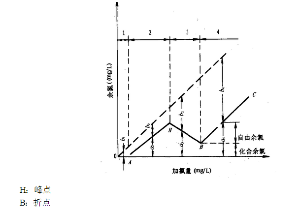 HB段:仍然是化合性余氯,加氯量繼續增加,氯氨被氧化成不起消毒作用的化合物,余氯反而減少。