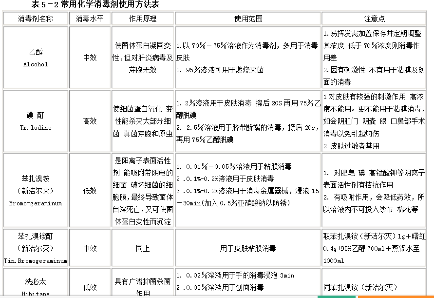 代入公式:5%×X=0.1%×3000 X=60ml答:需用5%新潔爾滅60ml。 5.常用化學(xué)消毒劑使用方法(5-2)