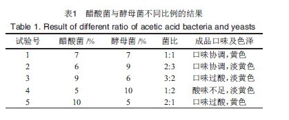 在發(fā)酵液中,酵母菌利用發(fā)酵液中的糖分,發(fā)酵成酒精,同時醋酸菌把生成的酒精轉化成醋酸,酸化發(fā)酵液,不同的菌比所產(chǎn)生的效果(表1)可知,選擇醋酸菌和酵母菌