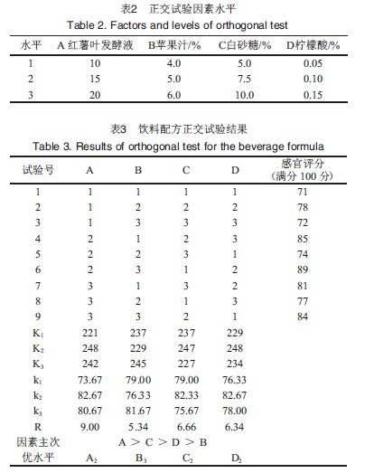 **優(yōu)水平為A2B3C2D2,即紅薯葉發(fā)酵飲料的**優(yōu)配方為紅薯葉發(fā)酵液15%,蘋果汁6.0%,白砂糖7.5%,檸檬酸0.10%,為了保持飲料的穩(wěn)定性,添加β-環(huán)糊精,添加量為0.8%。按正交試驗得出的配方進行飲料配制,得到的飲料經(jīng)感官評分為90分,說明此配方**佳。